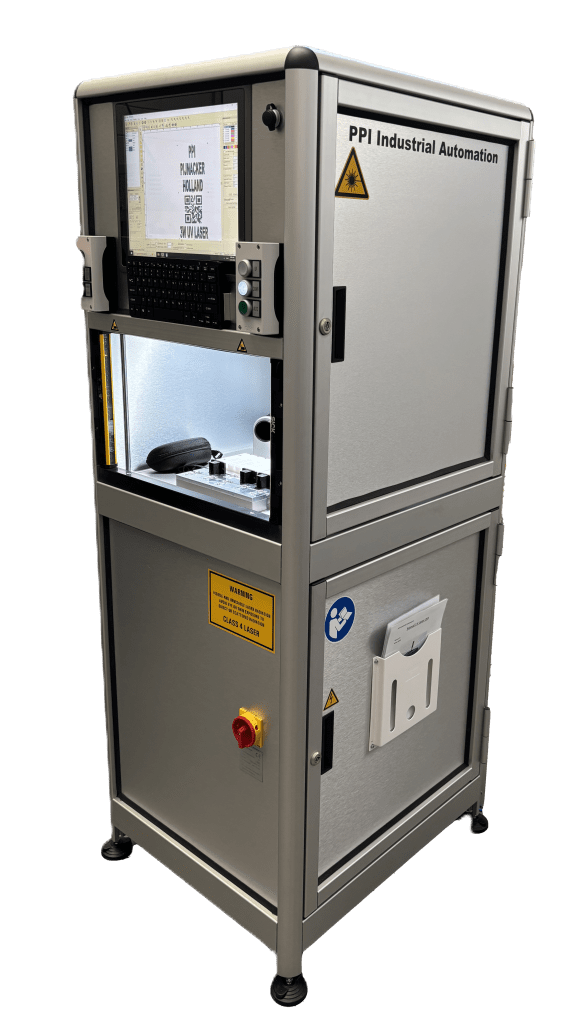 Op maat gemaakt lasermarkeersysteem. Leverbaar met UV laser voor het markeren van kunststof of met fiberlaser voor het markeren van metaal. Voorzien van volautomatische schuifdeur met groot laserveiligheids raam. Product opspanning en opties in overleg. Prijs en levertijd op aanvraag.